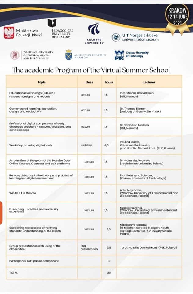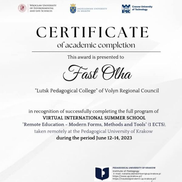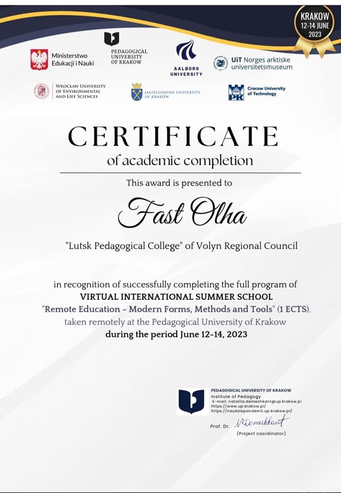 12-14 червня 202 року проректор з науково-педагогічної роботи та міжнародної співпраці, кандидат педагогічних наук, доцент Ольга Фаст взяла участь у Міжнародній літній школі «Remote Education – Modern Forms, Methods and Tools», організованій Педагогічним університетом у Кракові.