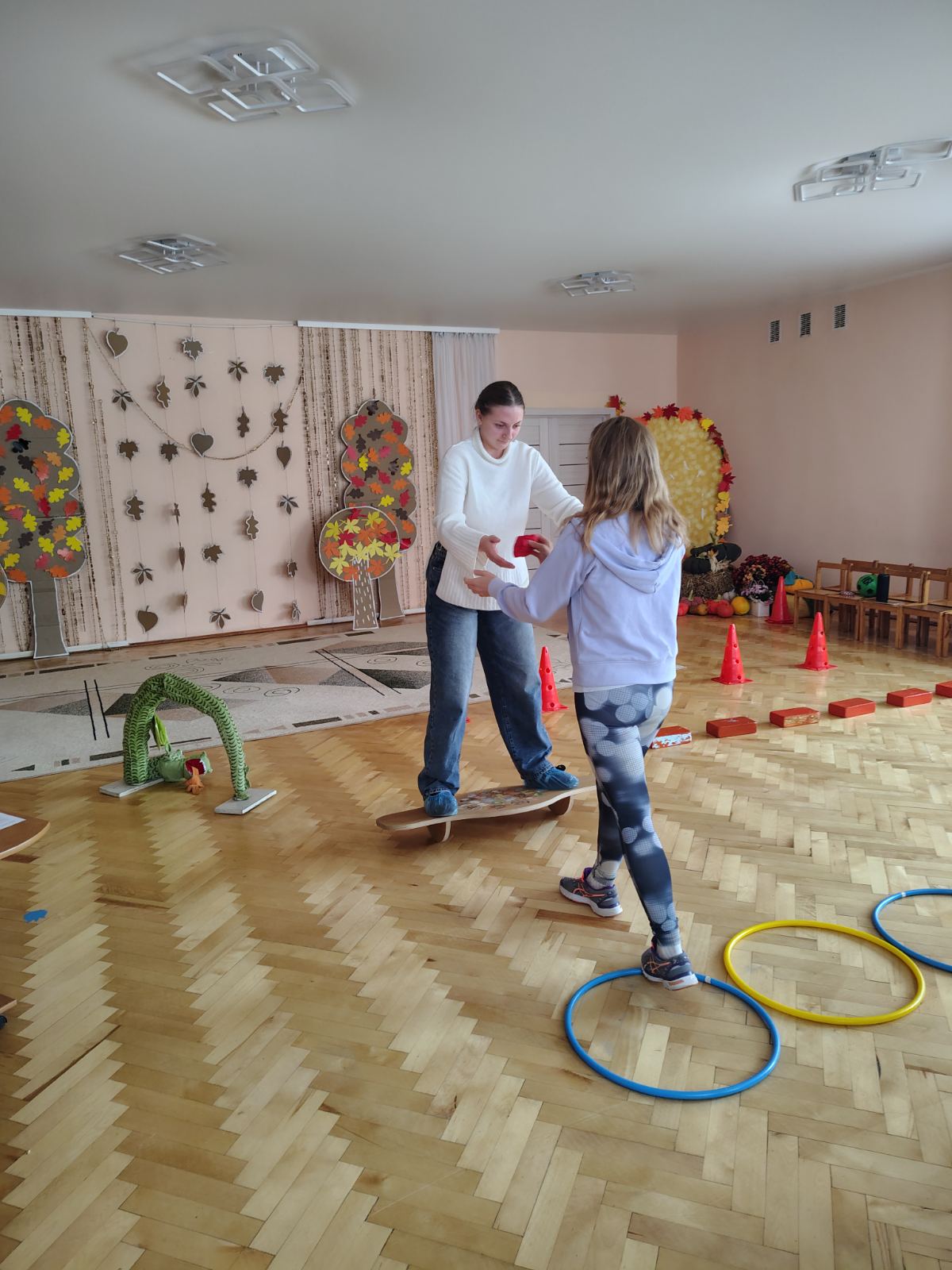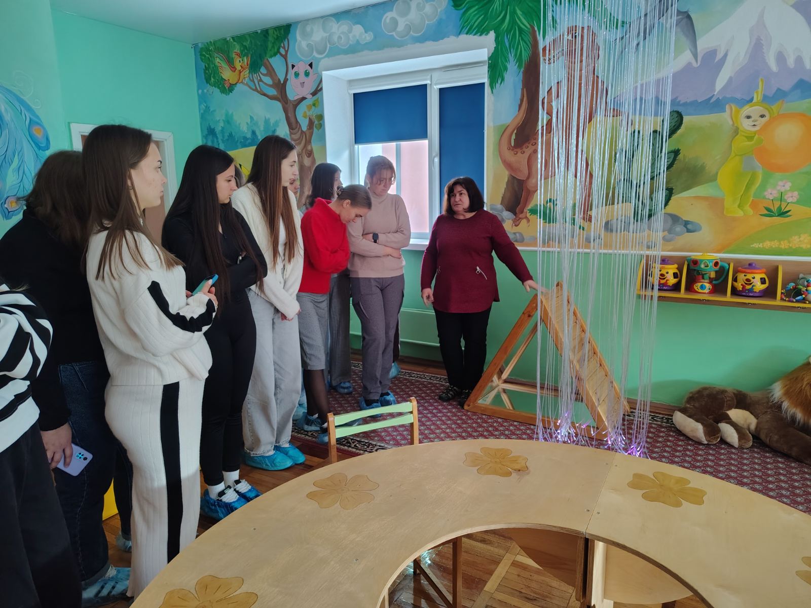 Інструктором з фізкультури Тетяною Купрінець студентам було продемонстровано, як адаптувати фізичні вправи та рухливі ігри для дітей з різними нозологіями. Розглянуто використання ігрових матеріалів, які стимулюють рухову активність та розвивають координацію, баланс та загальну моторику. Також студентів познайомили із середовищем: спортивною залою, ресурсною кімнатою. Було підкреслено роль команди психолого-педагогічного супроводу, яка включає вихователів, корекційних педагогів, асистента вихователя та інших фахівців. Обговорювалася важливість спільної роботи та обміну досвідом для розробки та реалізації індивідуального плану розвитку для кожної дитини з ООП.